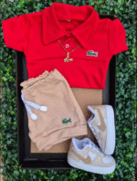 Body Polo Vermelho + Shorts Bege