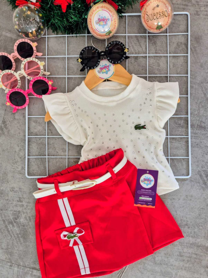 O conjunto é composto por blusinha off-white com aplicação de pérolas e saia vermelha com detalhe em laço e cinto branco, criando um visual sofisticado e cheio de charme para as pequenas brilharem nas festas.